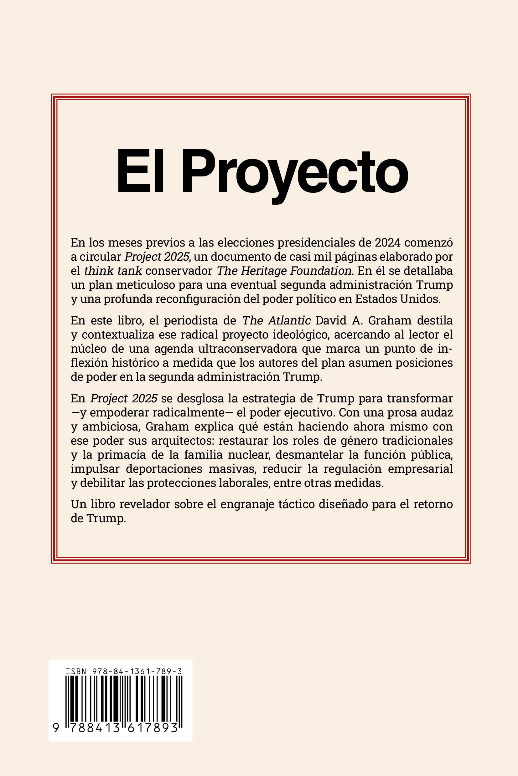 En El proyecto, el premiado periodista David A. Graham destila los elementos esenciales de este extenso documento y su estrategia para transformar —y empoderar radicalmente— el poder ejecutivo con vistas a restaurar las normas tradicionales de género y la supremacía de la familia nuclear, desmantelar la administración pública, llevar a cabo deportaciones masivas, reducir la regulación corporativa y las protecciones laborales, y mucho más.